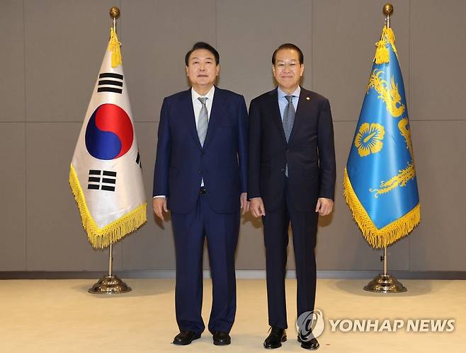 (세종=연합뉴스) 서명곤 기자 = 윤석열 대통령이 26일 오전 세종시 정부세종청사에서 국무회의에 앞서 열린 임명장 수여식에서 권영세 통일부 장관에게 임명장을 수여한 뒤 기념촬영을 하고 있다. 2022.5.26