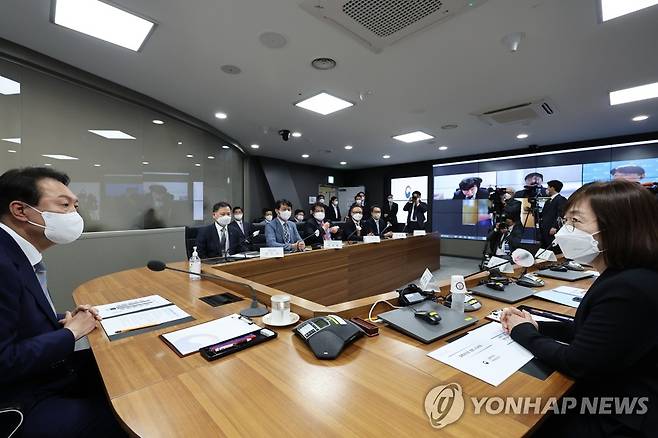 (청주=연합뉴스) 안정원 기자 = 윤석열 대통령이 26일 오후 충북 청주시 흥덕구 오송읍 질병관리청 내 긴급상황센터에서 브리핑을 받고 있다. 2022.5.26