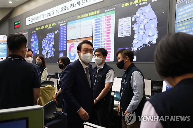 (청주=연합뉴스) 안정원 기자 = 윤석열 대통령이 26일 오후 충북 청주시 흥덕구 오송읍 질병관리청 긴급상황센터 내 긴급상황실을 방문, 직원들을 격려하고 있다. 2022.5.26