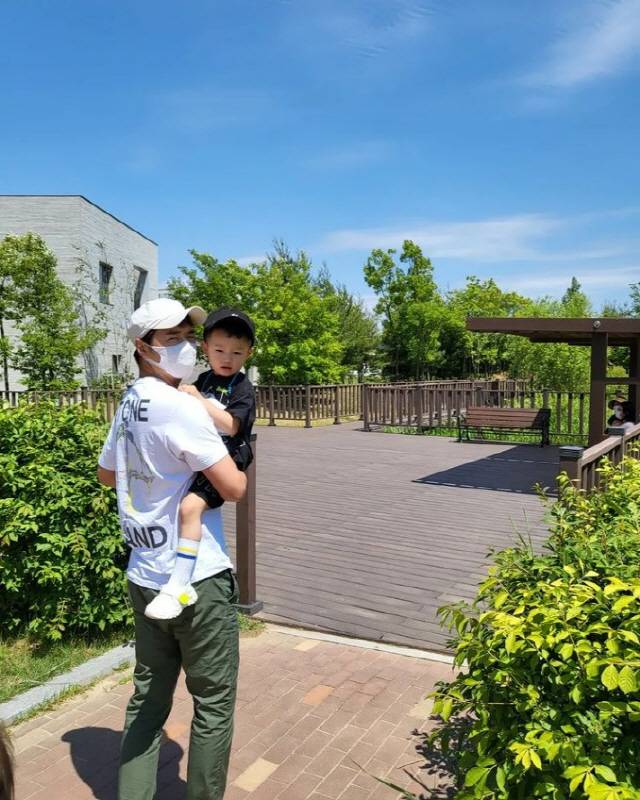 공개된 사진 속에는 구름 한점 없는 맑은 하늘을 배경으로 산책에 나서는 윤상현과 아들 희성 군의 모습.