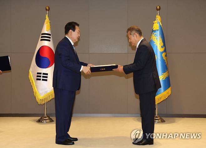 (세종=연합뉴스) 서명곤 기자 = 윤석열 대통령이 26일 오전 세종시 정부세종청사에서 국무회의에 앞서 열린 임명장 수여식에서 이상민 행정안전부 장관에게 임명장을 수여하고 있다. 2022.5.26