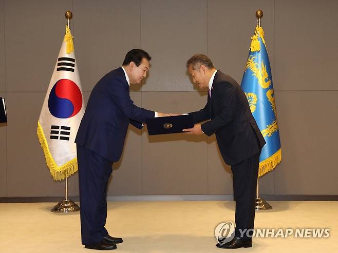 (세종=연합뉴스) 서명곤 기자 = 윤석열 대통령이 26일 오전 세종시 정부세종청사에서 국무회의에 앞서 열린 임명장 수여식에서 이상민 행정안전부 장관에게 임명장을 수여하고 있다. 2022.5.26