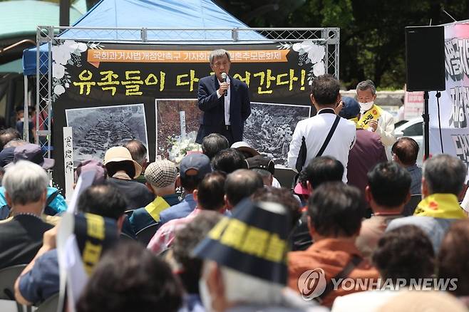 (서울=연합뉴스) 신현우 수습기자 = 한국전쟁 전후 민간인 피학살자 전국유족회 소속 회원들이 26일 오후 서울 여의도 국회 앞에서 과거사법 재개정안 통과를 촉구하고 있다. 2022.5.26