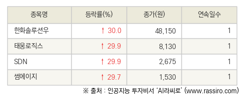 [fnRASSI]오늘의 상한가, 한화솔루션우 30.0% ↑