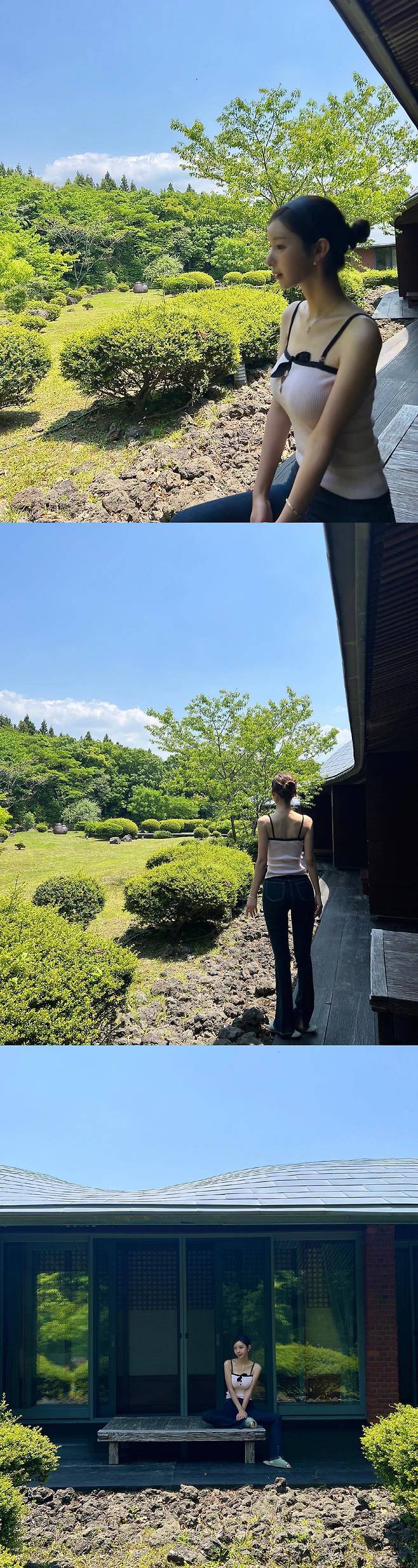 사진 속 야옹이 작가는 제주도 한라산 자락에 있는 한 디자인 호텔에서의 휴가를 공개했다. 특히 민소매 티셔츠에 그대로 드려난 가녀린 어깨와 완벽한 몸매가 눈길을 끌었다.