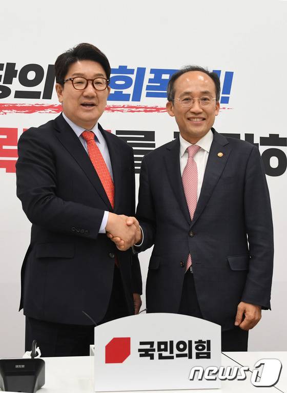 (서울=뉴스1) = 추경호 경제부총리 겸 기획재정부 장관이 26일 오후 여의도 국회에서 권성동 국민의힘 원내대표와 인사를 나누고 있다. (기획재정부 제공) 2022.5.26/뉴스1
