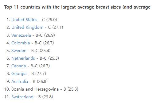 26일 미국의 인구정보 분석업체 세계인구리뷰(World Population Review·WPR)가 공개한 올해의 ‘세계 여성 가슴 크기’ 통계에 따르면, 미국 여성은 평균 C컵으로 1위에 올랐다. 영국은 평균치는 같았지만, 체질량지수(BMI)에서 뒤진 2위에 올랐다. 베네수엘라, 콜롬비아, 스웨덴, 네덜란드·캐나다는 평균 B컵과 C컵 사이를 기록하며 상위권을 형성했다. 조지아·호주·보스니아·스위스는 평균 B컵으로 뒤를 이었다. 한국은 조사 대상에 포함되지 않았다. 북한과 일본의 수치도 조사되지 않은 가운데, 중국은 AA와 A컵 사이를 기록하며 가슴 크기가 작은 국가에 속했다.