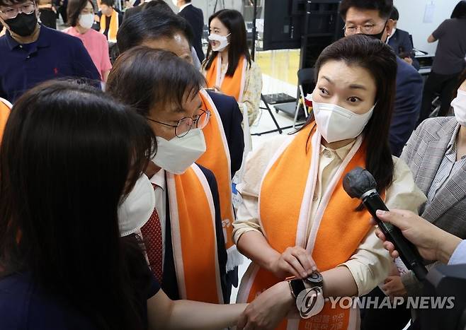 (서울=연합뉴스) 홍해인 기자 = 국민의힘 김예지 의원(오른쪽)이 26일 오후 서울 영등포구 타임스퀘어에서 열린 제17회 대한민국 보조공학기기 박람회 개회식에서 점차시계로 현재 시간을 확인하는 모습을 이정식 고용노동부 장관이 바라보고 있다. 2022.5.26