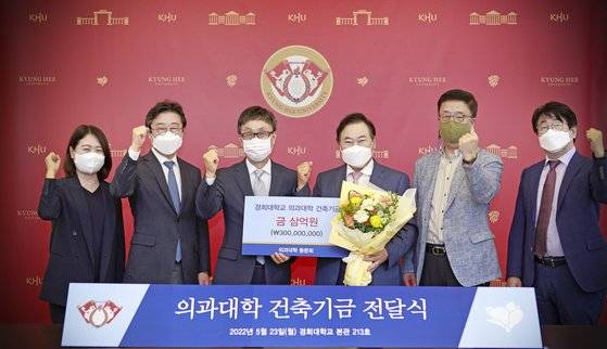 경희대학교(총장 한균태) 의과대학 동문회가 모교에 ‘의과대학 건축기금’으로 3억 원을 기부했다. 기금 전달식은 5월 23일(월) 오후 서울캠퍼스 본관 213호에서 개최됐다. 경희대에서는 한균태 총장과 의과대학 우정택 학장 등이 이들을 맞이했고, 의과대학 동문회에서는 이송 동문회장(서울성심병원 원장)과 조용현 부회장(서울성심병원 마취통증의학과), 박성진 사무총장(의학과 교수) 등이 참석했다. 행사는 환담과 총장 인사말, 동문회장 인사말, 기부증서·감사패 전달식, 단체 사진 촬영 순으로 진행됐다.