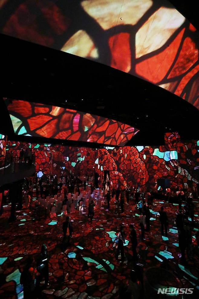 [서울=뉴시스] 추상철 기자 = 빛의 시어터 개관식이 열린 26일 오후 서울 광진구 그랜드 워커힐 서울 내 빛의 시어터에서 개관식 참석자들이 디지털 전시회를 관람하고 있다. 2022.05.26. scchoo@newsis.com