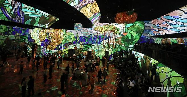 [서울=뉴시스] 추상철 기자 = 빛의 시어터 개관식이 열린 26일 오후 서울 광진구 그랜드 워커힐 서울 내 빛의 시어터에서 개관식 참석자들이 디지털 전시회를 관람하고 있다. 2022.05.26. scchoo@newsis.com