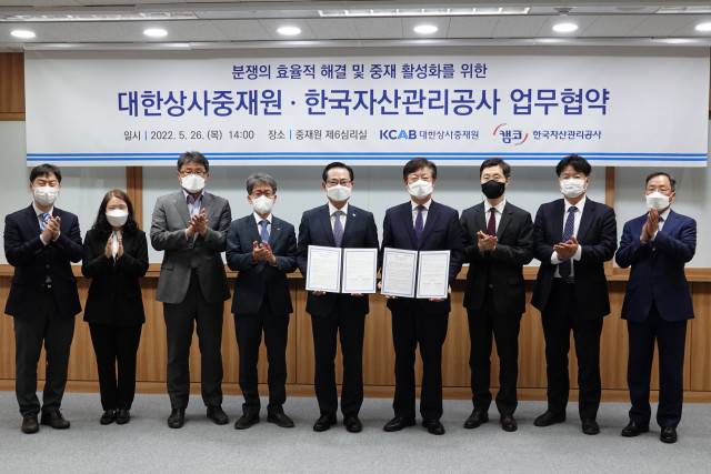 대한상사중재원(원장 맹수석, 이하 중재원)과 한국자산관리공사(사장 권남주, 이하 캠코)는 5월 26일(목) 서울 삼성동 중재원 제6심리실에서 업무 협약을 맺고 양 기관의 협력 강화를 약속했다.