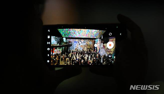 [서울=뉴시스] 추상철 기자 = 빛의 시어터 개관식이 열린 26일 오후 서울 광진구 그랜드 워커힐 서울 내 빛의 시어터에서 참석자가 디지털 전시 작품을 휴대폰 카메라에 담고 있다. 2022.05.26. scchoo@newsis.com