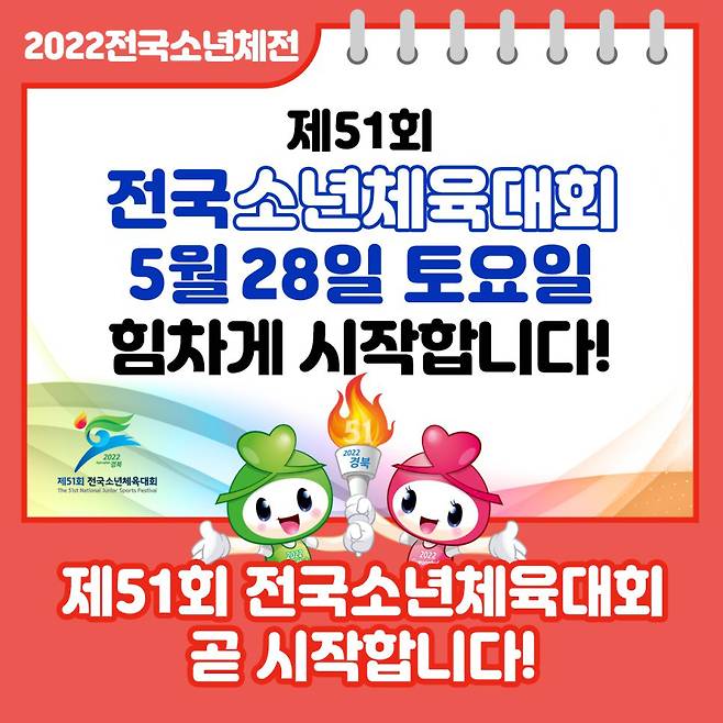 제51회 전국소년체육대회가 5월 28일부터 31일까지 나흘간 주 개최지인 구미시를 포함해 경상북도 내 11개 시군과 충청북도 2개 시군에서 펼쳐집니다.