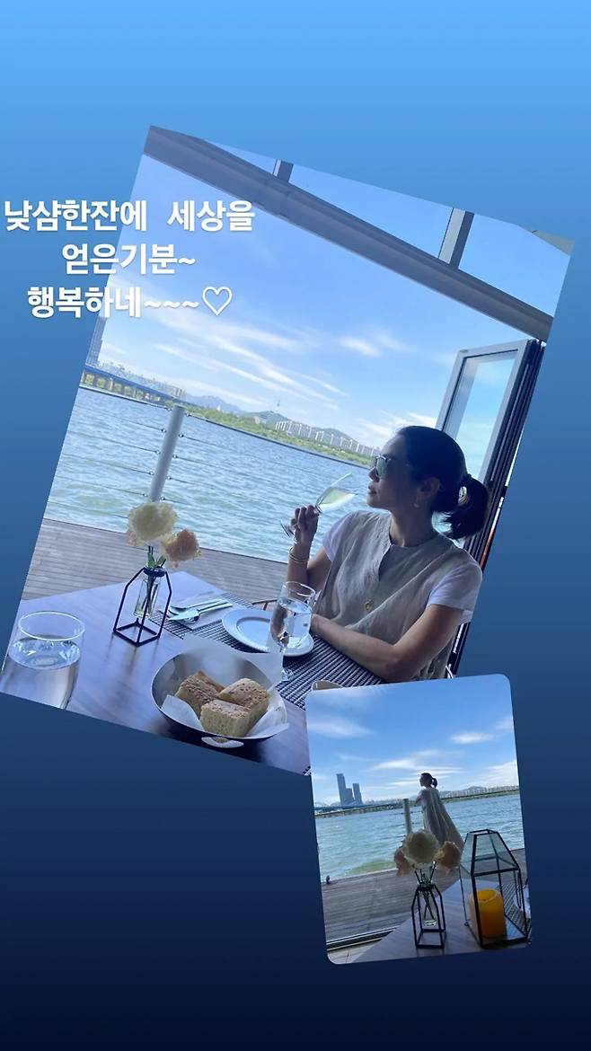 공개된 사진 속 김지호와 김호진은 한강이 바로 보이는 레스토랑에서 샴페인 한 잔을 하며 우아하게 데이트를 즐기고 있는 모습. 김지호는 "낮 샴페인 한 잔에 세상을 얻은 기분~행복하네~"라며 만족감을 표현했다.