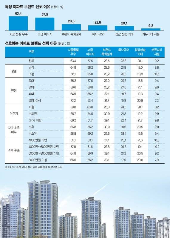 아파트 브랜드를 선택한 기준으로 '시공품질 우수(63.4%)'가 1순위로 꼽혔다. 이어 고급 이미지(57.5%), 브랜드특화 설계(28.5%), 회사 규모(22.8%), 집값 상승 기대(20.1%), 커뮤니티시설(9.2%) 등의 순이다.