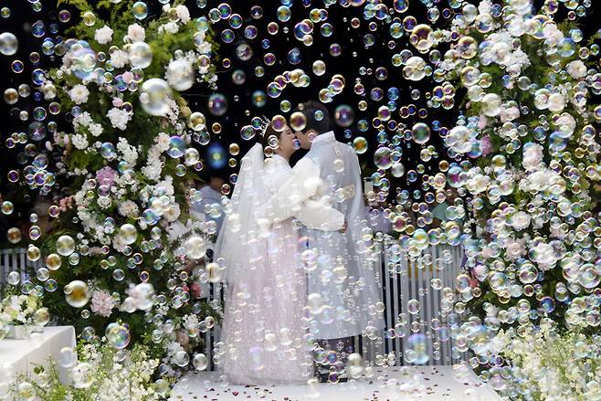 햇볕이 풍부해지고 만물이 생장해 가득 찬다는 소만, 5월21일은 둘이 하나 되는 부부의 날이기도 했다. 한복 곱게 차려입고 혼례를 치르는 신부와 신랑에겐 코로나19로 미뤘던 늦은 사랑의 결실이라 더 뜻깊다. 작은 사랑들이 모여 큰 꿈이 되어줄 약속처럼 피어나는 비눗방울마다 무지개가 가득 담겼으니, 이 또한 축복의 꽃눈 같다. 서로 믿고 존중해줄 때 행복은 따라온단다.