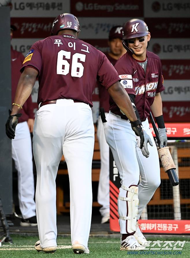 2022 KBO리그 키움 히어로즈와 LG 트윈스의 경기가 26일 잠실야구장에서 열렸다. 3회초 무사 2루 키움 김태진의 1타점 2루타때 득점에 성공한 푸이그가 이정후와 기쁨을 나누고 있다. 잠실=허상욱 기자wook@sportschosun.com/2022.05.26/