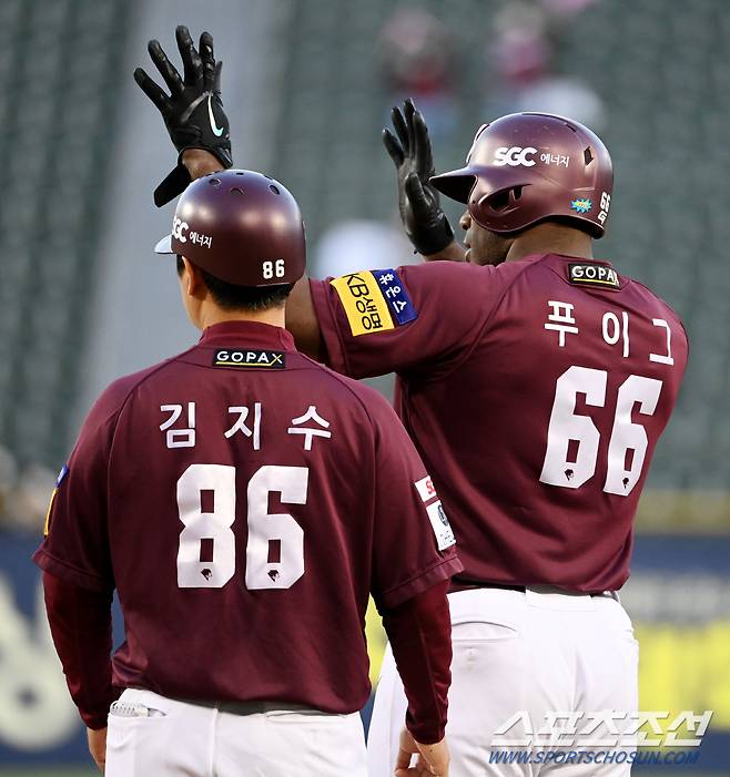 2022 KBO리그 키움 히어로즈와 LG 트윈스의 경기가 26일 잠실야구장에서 열렸다. 3회초 2사 1,2루 키움 푸이그가 1타점 적시타를 치고 기쁨을 나누고 있다. 잠실=허상욱 기자wook@sportschosun.com/2022.05.26/