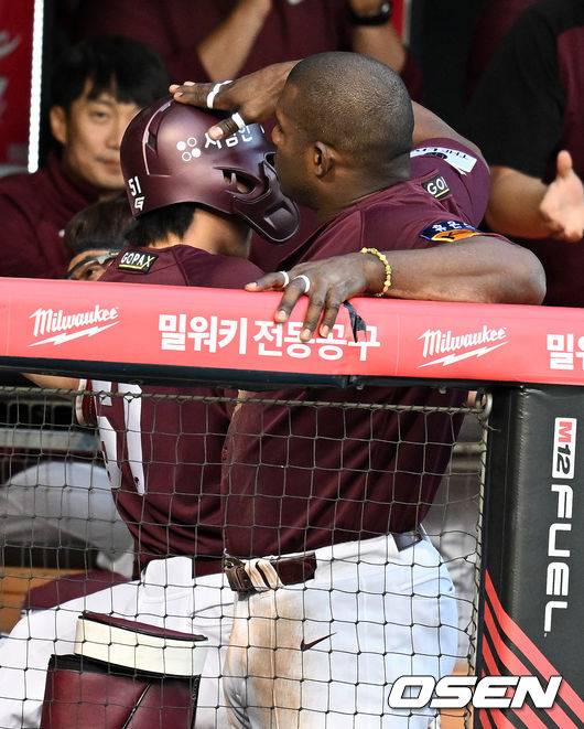 3회초 1사 만루에서 키움 이정후가 송성문의 싹쓸이 3타점 적시 2루타에 득점을 올리고 푸이그와 기뻐하고 있다. 2022.05.26 /jpnews@osen.co.kr