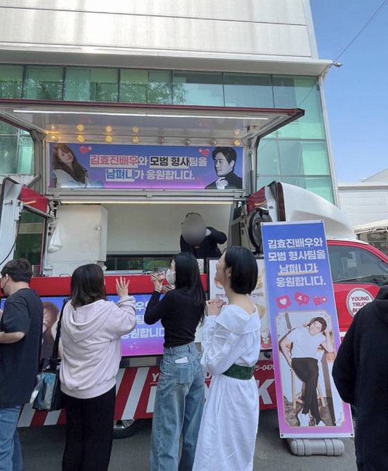 사진 속에는 남편인 배우 유지태가 보내준 분식차, 커피차 앞에서 사진을 촬영 중인 김효진의 모습이 담겨있다. 현재 JTBC 새 드라마 '모범형사2'를 촬영 중인 아내와 스태프들을 위한 유지태의 깜짝 선물. 유지태는 "김효진 배우와 '모범형사'팀을 남펴니가 응원합니다"라면서 응원 문구까지 더해 아내를 응원했다. 이에 김효진은 남편의 든든한 외조에 환한 미소와 브이 포즈로 기쁜 마음을 드러냈다.