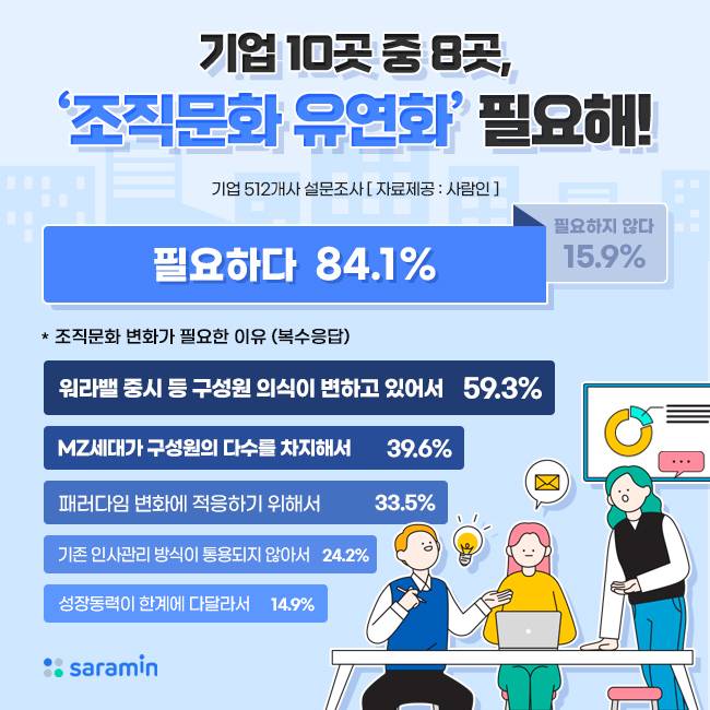 26일 커리어테크 플랫폼 사람인은 기업 447개사를 대상으로 '조직 문화 유연화'에 대해 설문 조사한 결과, 84.1%가 '조직 문화의 유연화가 필요하다'고 답했다.