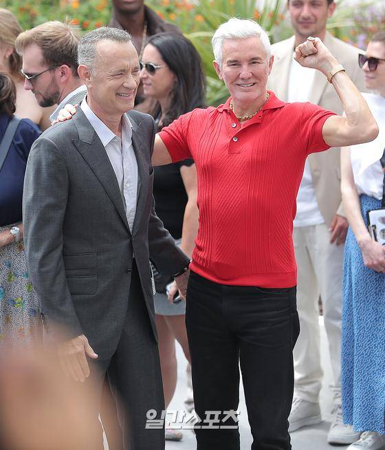배우 톰 행크스와 배즈 루어먼 감독이 26일(현지시간) 오후 프랑스 칸 팔레 데 페스티발에서 열린 '제75회 칸 국제영화제'(Cannes Film Festival) 영화 ‘엘비스’ 포토콜에 참석해 포즈를 취하고 있다.