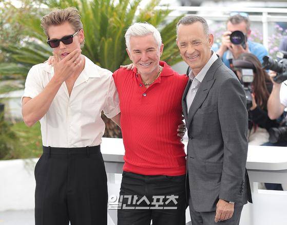 배즈 루어먼 감독과 배우 오스틴, 버틀러, 톰 행크스가 26일(현지시간) 오후 프랑스 칸 팔레 데 페스티발에서 열린 '제75회 칸 국제영화제'(Cannes Film Festival) 영화 ‘엘비스’ 포토콜에 참석해 포즈를 취하고 있다.