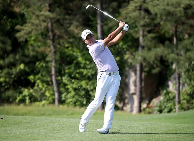 [서울=뉴시스] 이영환 기자 = 26일 경기 이천 블랙스톤 이천GC(북서코스)에서열린 KB금융 리브챔피언십 1라운드, 함정우가 17번홀에서 세컨 아이언샷을 하고 있다. (사진=KPGA 제공) 2022.05.26. photo@newsis.com *재판매 및 DB 금지