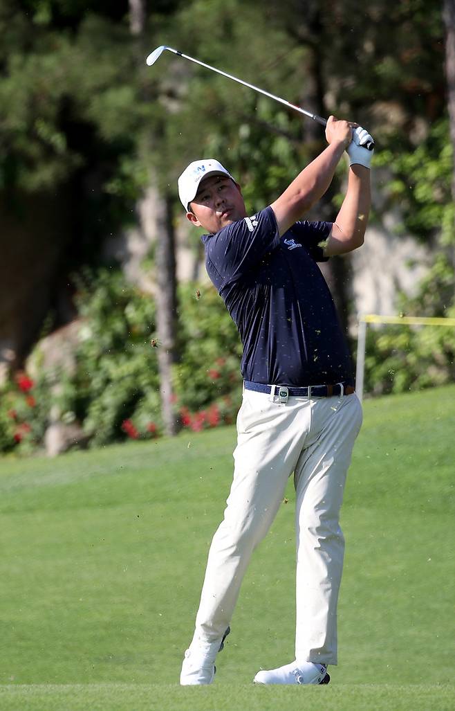 [서울=뉴시스] 이영환 기자 = 26일 경기 이천 블랙스톤 이천GC(북서코스)에서열린 KB금융 리브챔피언십 1라운드, 이원준이 17번홀에서 세컨 아이언샷을 하고 있다. (사진=KPGA 제공) 2022.05.26. photo@newsis.com *재판매 및 DB 금지
