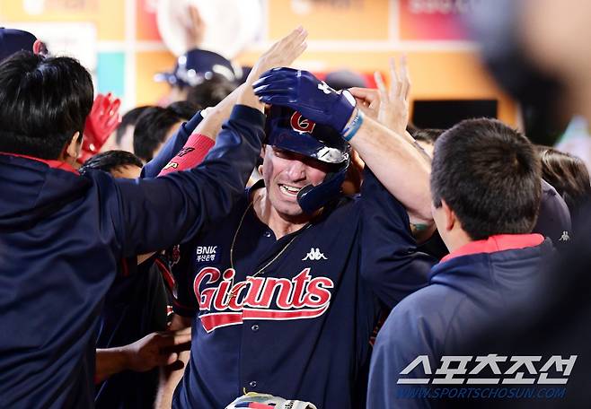 26일 인천 SSG랜더스필드에서 KBO리그 SSG와 롯데의 경기가 열렸다. 7회 롯데 피터스가 역전 3점홈런을 날렸다. 더그아웃에서 동료들과 하이파이브를 나누고 있는 피터스. 인천=송정헌 기자songs@sportschosun.com/2022.05.26/