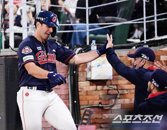 26일 인천 SSG랜더스필드에서 KBO리그 SSG와 롯데의 경기가 열렸다. 7회 롯데 피터스가 역전 3점홈런을 날렸다. 더그아웃에서 서튼 감독과 하이파이브를 나누고 있는 피터스. 인천=송정헌 기자songs@sportschosun.com/2022.05.26/