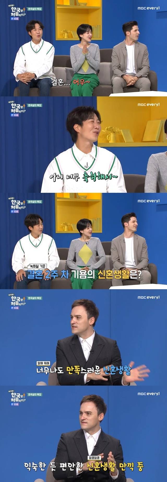 도경완은 “결혼... 왜? 아니, 너무 축하해서”라고 너스레를 떨며 신혼생활을 질문했다. 기욤은 “너무 좋다”며 “와이프와 캐나다에서 붙어살았다. 코로나 격리 때문에. 신혼부부지만 신혼생활은 오래 했다”고 답했다.