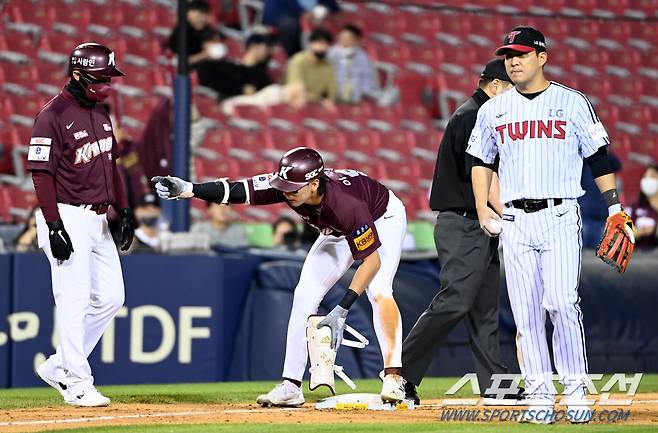 2022 KBO리그 키움 히어로즈와 LG 트윈스의 경기가 26일 잠실야구장에서 열렸다. 8회초 1사 1루 키움 이정후가 1타점 3루타를 치고 기쁨을 나누고 있다.잠실=허상욱 기자wook@sportschosun.com/2022.05.26/