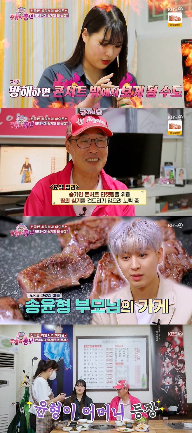 한편, 아버지는 티켓팅을 위해 딸을 데리고 고깃집을 방문했는데, 불판을 본 송윤형은 "저거 우리 고깃집인데?"라며 놀라워했다. 이어 송윤형의 어머니가 등장했는데, 10년차 팬이 "아이콘에서 누가 제일 잘 생긴 것 같냐"는 질문에 "그래도 윤형이"라고 답하는 센스를 선보이기도 했다. 더불어 아버님과 함께 콘서트를 오라는 요청을 했는데, 아버지는 "저는 가인님 콘을 가야해서"라며 정중히 거절했다.