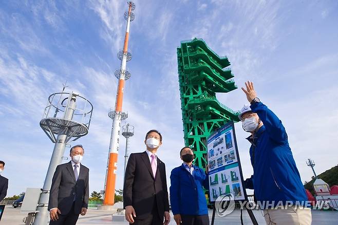 (서울=연합뉴스) 이종호 과학기술정보통신부 장관이 26일 오후 전라남도 고흥군 나로우주센터를 방문해 발사대 준비 현황을 점검하고 있다.