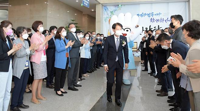 [청주=뉴시스] 강종민 기자 = 김강립 식품의약품안전처장이 26일 충북 청주 식약처에서 퇴임식을 마치고 직원들의 박수를 받으며 청사를 나서고 있다. 2022.05.26.(사진=식약처 제공) photo@newsis.com *재판매 및 DB 금지
