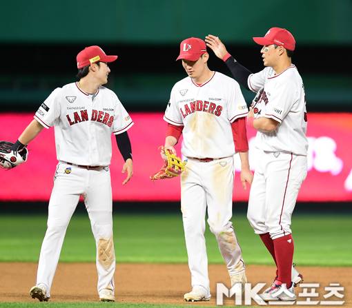 한유섬 '외야수들 모두 수고했어' ][MK포토]
