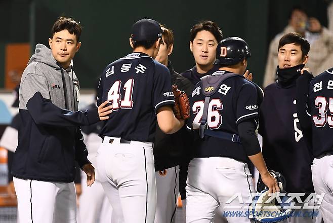 2022 KBO리그 한화 이글스와 두산 베어스의 경기가 26일 한화생명이글스파크에서 열렸다. 경기에서 승리한 두산 선수들이 기뻐하고 있다. 대전=박재만 기자 pjm@sportschosun.com/2022.05.26/
