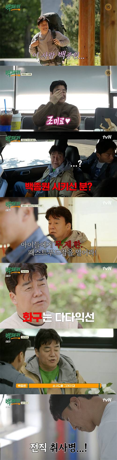 이날 백종원은 자신의 몸통보다 커다란 배낭을 메고 등장해 몸을 휘청거려 궁금증을 자아냈다.