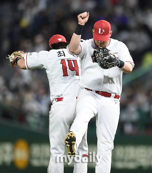 [마이데일리 = 인천 유진형 기자] SSG가 26일 오후 인천 SSG랜드스필드에서 진행된 '2022 신한은행 SOL KBO리그' 롯데 자이언츠와 SSG 랜더스의 경기에서 6-5로 승리한 뒤 기뻐하고 있다.
