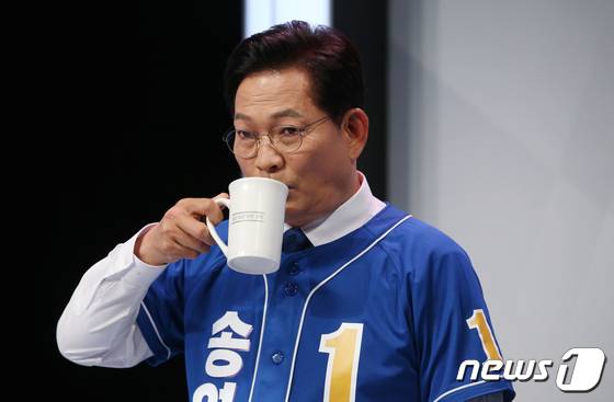 (서울=뉴스1) 국회사진취재단 = 송영길 더불어민주당 서울시장 후보가 26일 오후 서울 마포구 MBC에서 열린 서울시장 후보자 TV 토론회에서 물을 마시고 있다. 2022.5.26/뉴스1