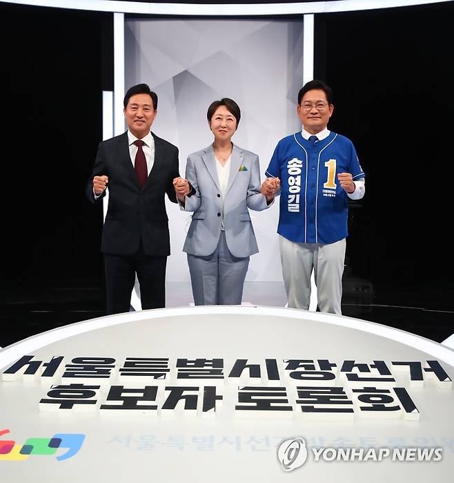 (서울=연합뉴스) 6.1 지방선거 서울시장 후보들이 26일 서울 상암 MBC스튜디오에서 열린 서울특별시장 선거 후보자 토론회에 앞서 기념촬영을 하고 있다. 왼쪽부터 국민의힘 오세훈 후보, 정의당 권수정 후보, 더불어민주당 송영길 후보. 2022.5.26 [국회사진기자단]