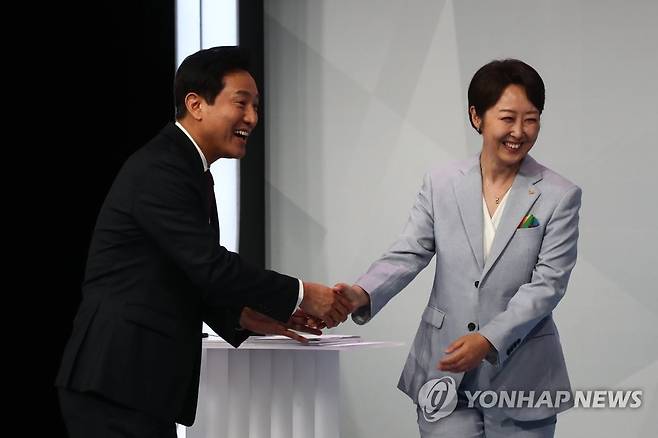 (서울=연합뉴스) 국민의힘 오세훈 서울시장 후보(왼쪽)와 정의당 권수정 서울시장 후보가 26일 서울 상암 MBC스튜디오에서 열린 서울특별시장 선거 후보자 토론회에서 인사하고 있다. 2022.5.26 [국회사진기자단]