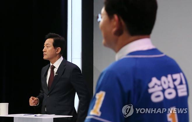 (서울=연합뉴스) 더불어민주당 송영길 서울시장 후보(오른쪽)와 국민의힘 오세훈 서울시장 후보가 26일 서울 상암 MBC스튜디오에서 열린 서울특별시장 선거 후보자 토론회에서 토론 준비를 하고 있다. 2022.5.26 [국회사진기자단]