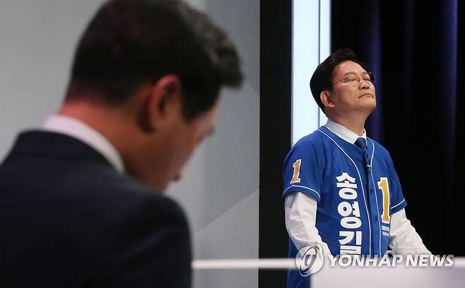 (서울=연합뉴스) 더불어민주당 송영길 서울시장 후보(오른쪽)와 국민의힘 오세훈 서울시장 후보가 26일 서울 상암 MBC스튜디오에서 열린 서울특별시장 선거 후보자 토론회에서 토론 준비를 하고 있다. 2022.5.26 [국회사진기자단]