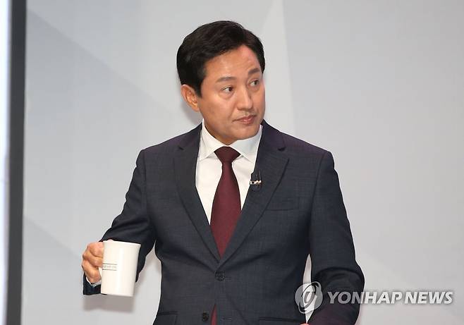 (서울=연합뉴스) 국민의힘 오세훈 서울시장 후보가 26일 서울 상암 MBC스튜디오에서 열린 서울특별시장 선거 후보자 토론회에서 물을 마시고 있다. 2022.5.26 [국회사진기자단]