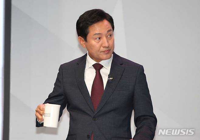 [서울=뉴시스] 국회사진기자단 = 오세훈 국민의힘 서울시장 후보가 26일 서울 마포구 상암동 MBC 스튜디오에서 열린 서울시장 후보자 TV 토론회에서 물을 마시고 있다. 2022.05.26. photo@newsis.com