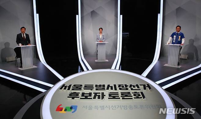 [서울=뉴시스] 국회사진기자단 = 오세훈 국민의힘 서울시장 후보, 권수정 정의당 서울시장 후보, 송영길 더불어민주당 서울시장 후보가 26일 서울 마포구 상암동 MBC 스튜디오에서 열린 서울시장 후보자 TV 토론회를 준비하고 있다. 2022.05.26. photo@newsis.com
