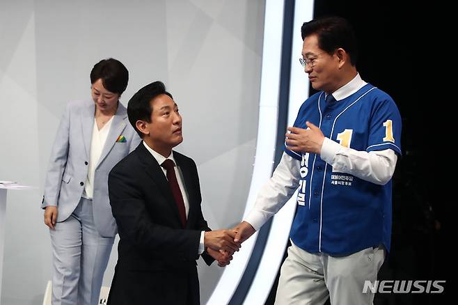 [서울=뉴시스] 국회사진기자단 = 오세훈 국민의힘 서울시장 후보와 송영길 더불어민주당 서울시장 후보가 26일 서울 마포구 상암동 MBC 스튜디오에서 열린 서울시장 후보자 TV 토론회에서 인사를 나누고 있다. 2022.05.26. photo@newsis.com